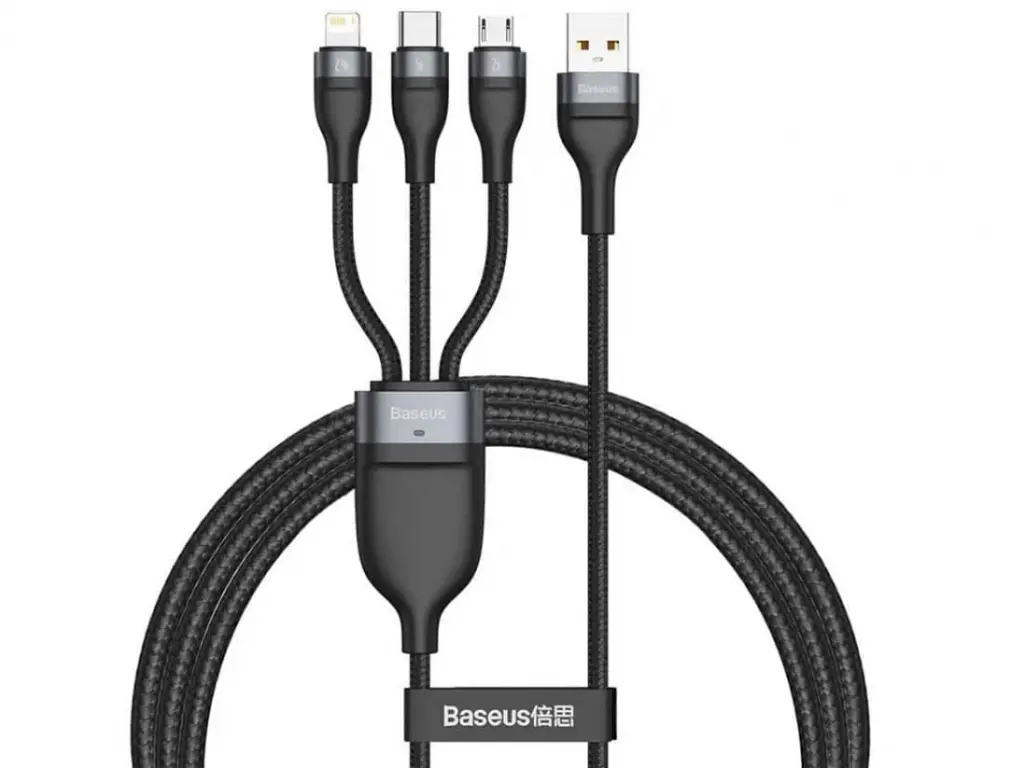کابل شارژ USB به THREE سهکاره مدل CB000161 برند BASEUS بیسوس برای شارژ همزمان دستگاههای مختلف طراحی شده است.