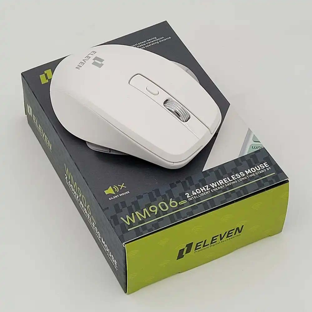 موس بیسیم مدل M906 برند ELEVEN الون سفید – 6 کلید – بی صدا – گارانتی رایان اروند 12